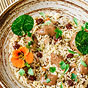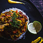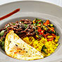 Poulet désossé cuit avec riz basmati et épices indiennes, servi avec sauce raïti.