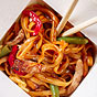 Poulet, nouilles udon, carotte, oignon rouge, chou blanc sauté, concombre, coriandre, sauce yakisoba, spicy mayo.
